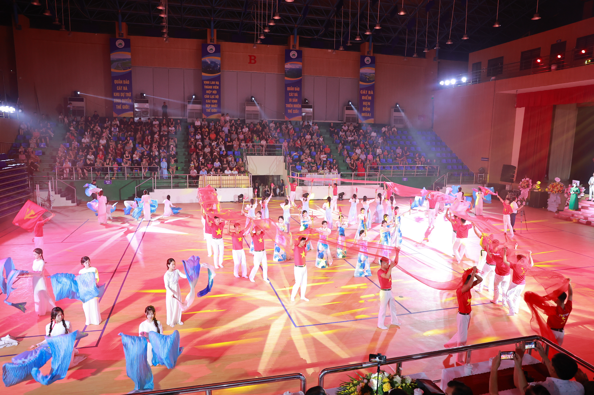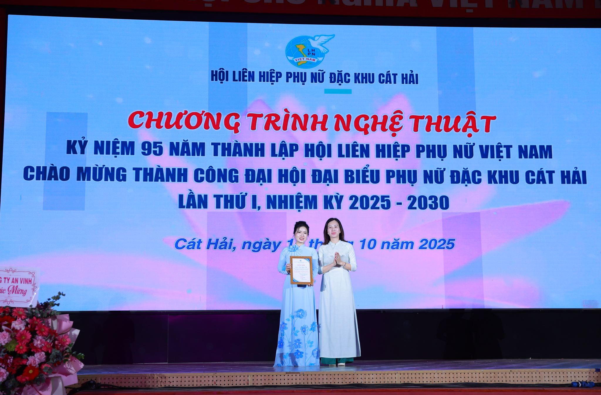 Cát Hải, 18/10 — Trong không gian rực rỡ ánh đèn tại Trung tâm Văn hóa – Thông tin và Thể thao Đặc khu Cát Hải, chương trình nghệ thuật “Dấu chân của sóng” đã mang đến một đêm cảm xúc dạt dào, tôn vinh vẻ đẹp, nghị lực và cống hiến của người phụ nữ Cát Hải nhân kỷ niệm 95 năm thành lập Hội Liên hiệp Phụ nữ Việt Nam (1930–2025) và chào mừng Ngày Phụ nữ Việt Nam 20/10.