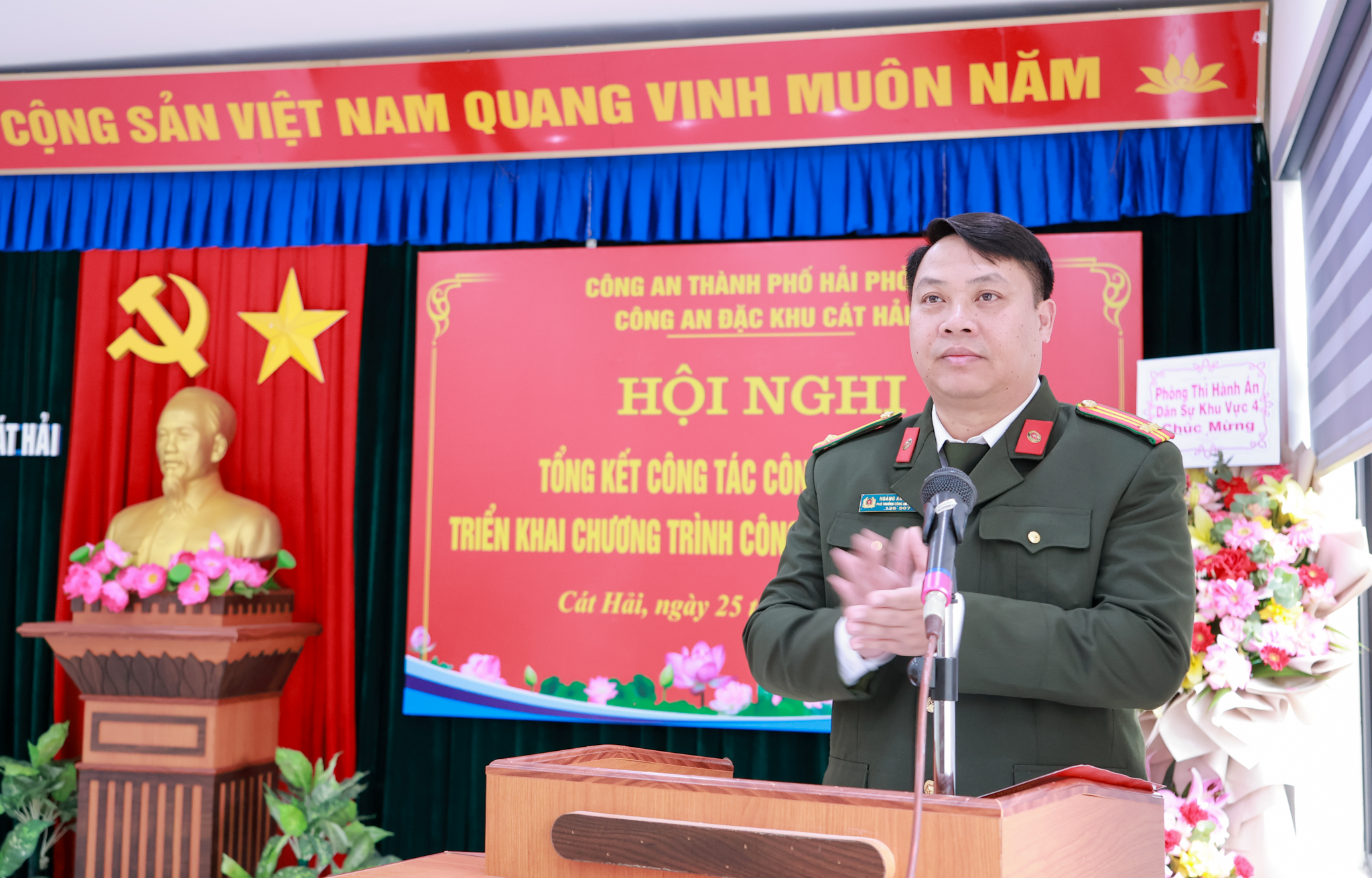 (Trung tá Hoàng Anh Tuấn - Phó Trưởng Công an đặc khu Cát Hải phát biểu)