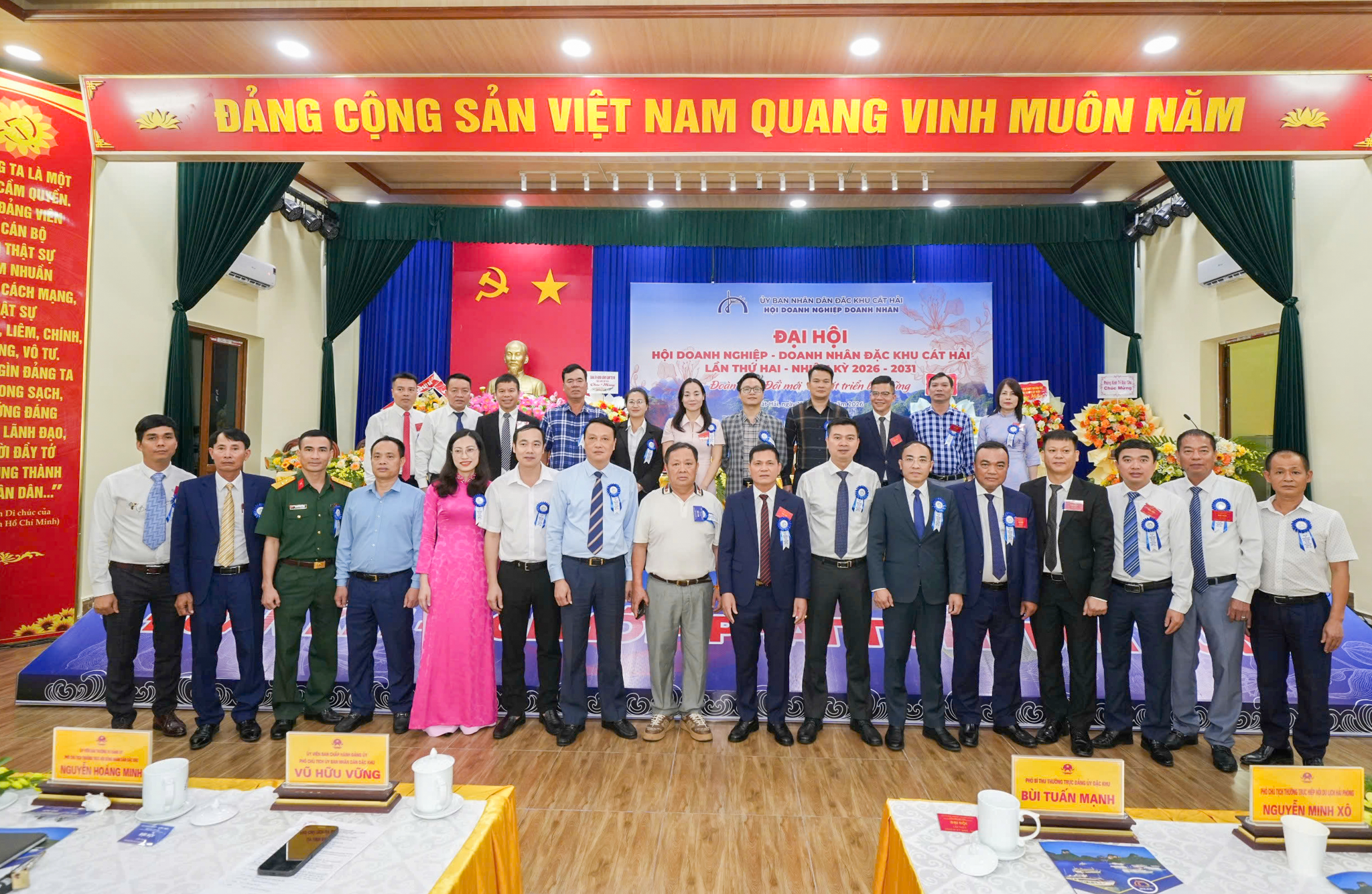 Các đồng chí lãnh đạo Đặc khu Cát Hải chụp ảnh lưu niệm cùng Ban Chấp hành Hội Doanh nghiệp – Doanh nhân nhiệm kỳ 2026–2031