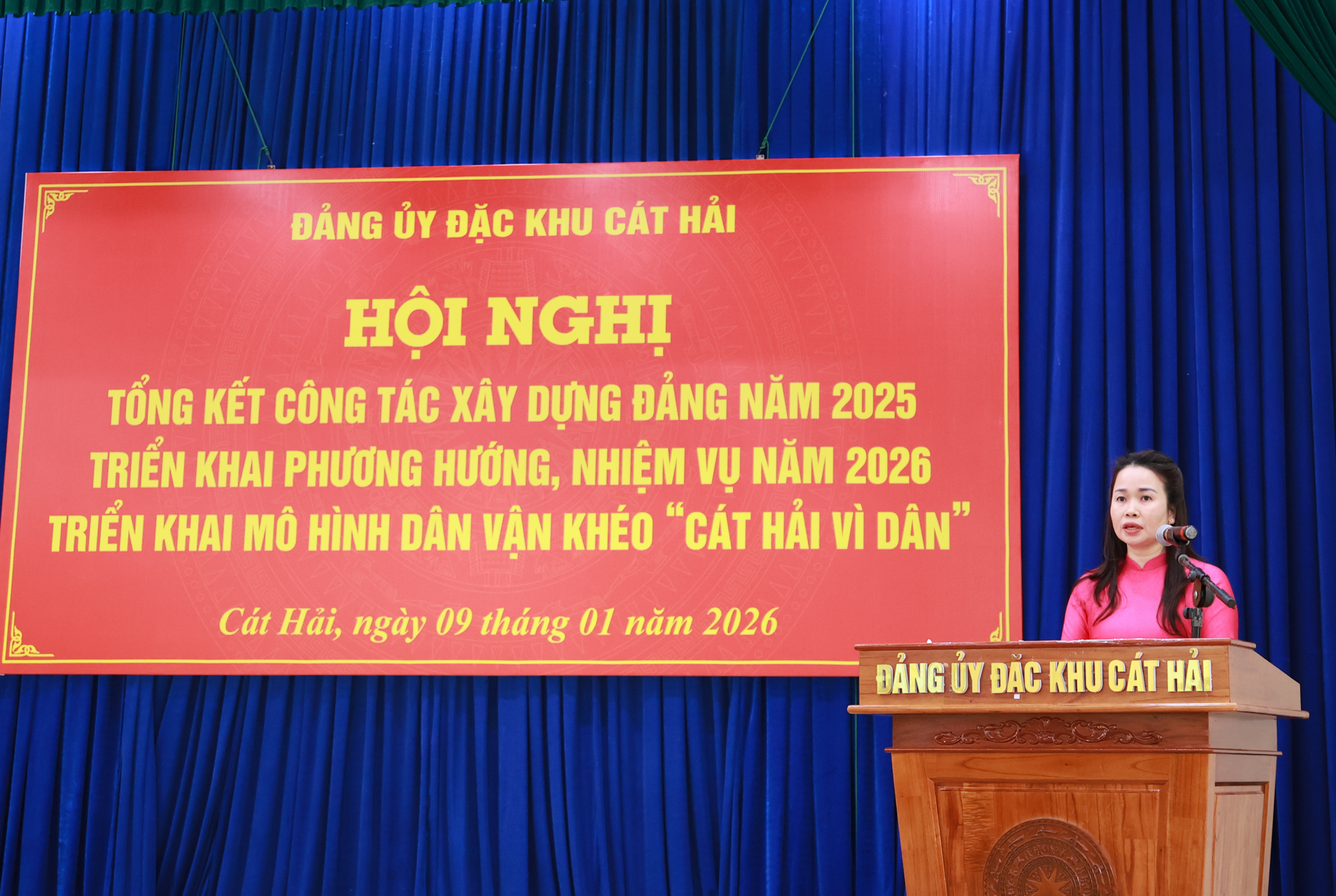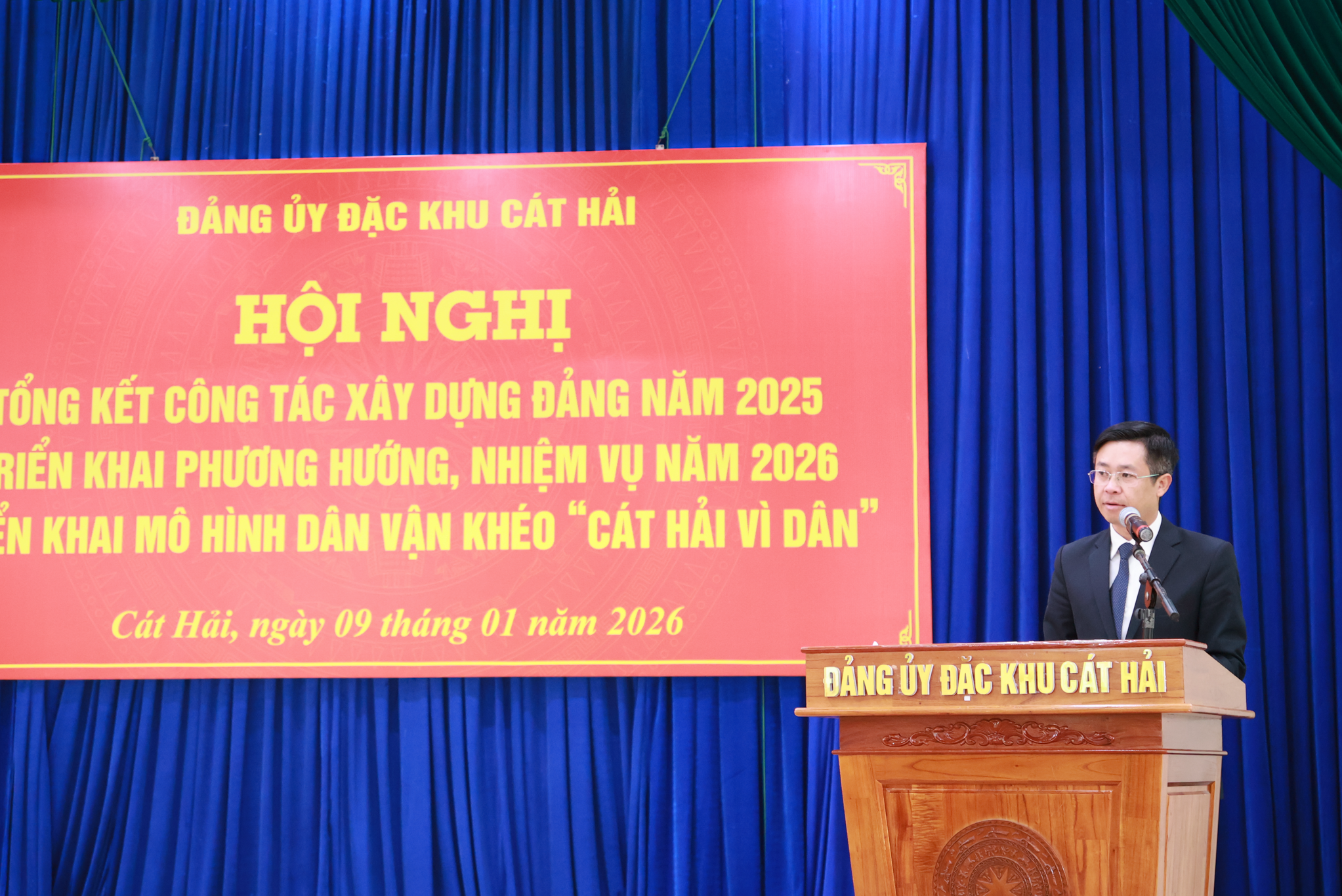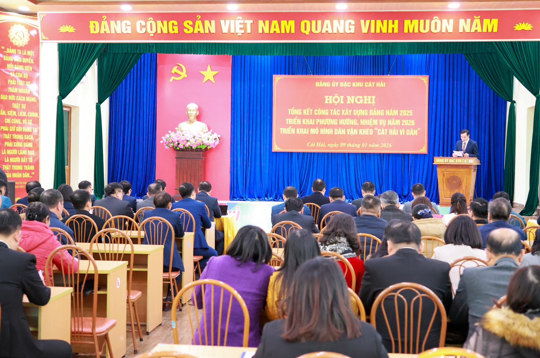 Tại hội nghị, các đại biểu đã nghe báo cáo tổng kết công tác xây dựng Đảng năm 2025. Trong bối cảnh Đảng bộ đặc khu Cát Hải được thành lập và đi vào hoạt động từ ngày 1/7/2025 theo mô hình chính quyền địa phương hai cấp, Ban Chấp hành, Ban Thường vụ Đảng ủy đặc khu đã tập trung lãnh đạo, chỉ đạo kiện toàn tổ chức bộ máy; ban hành quy chế làm việc, chương trình công tác toàn khóa và các chương trình chuyên đề, bảo đảm sự vận hành ổn định, thông suốt của hệ thống chính trị.