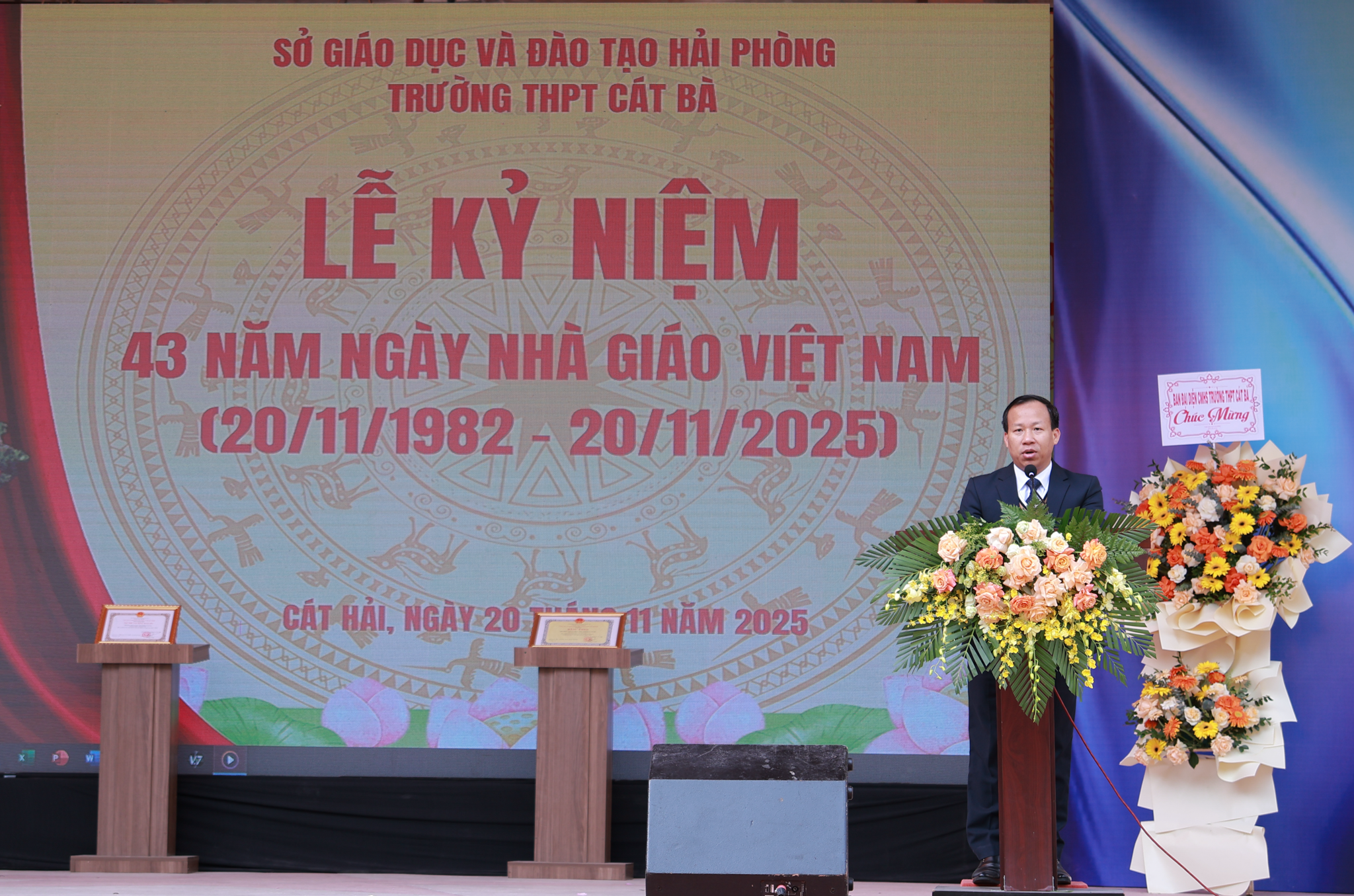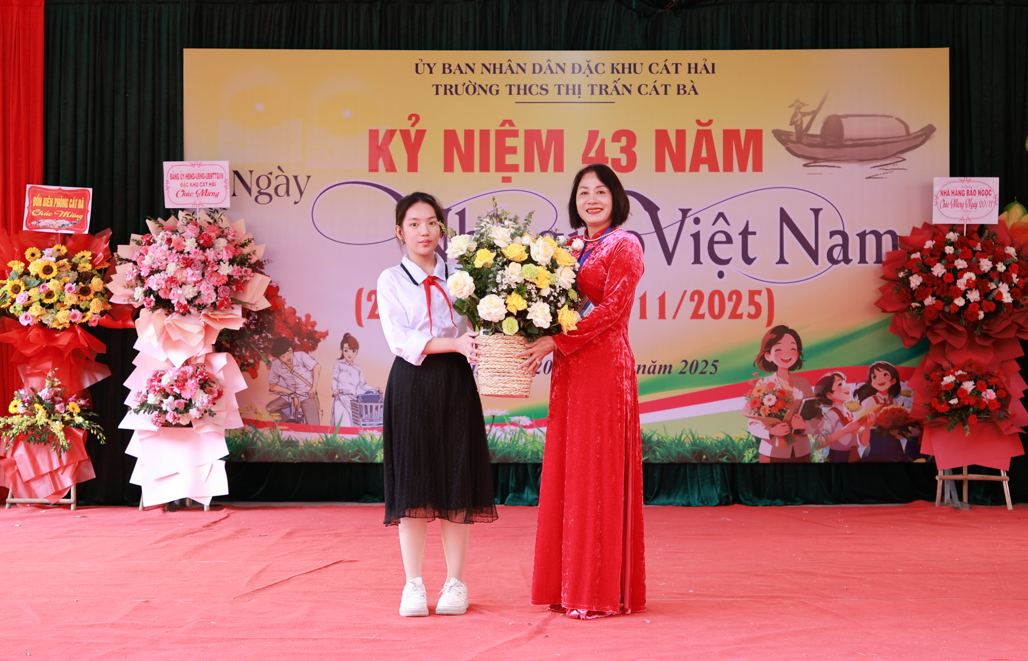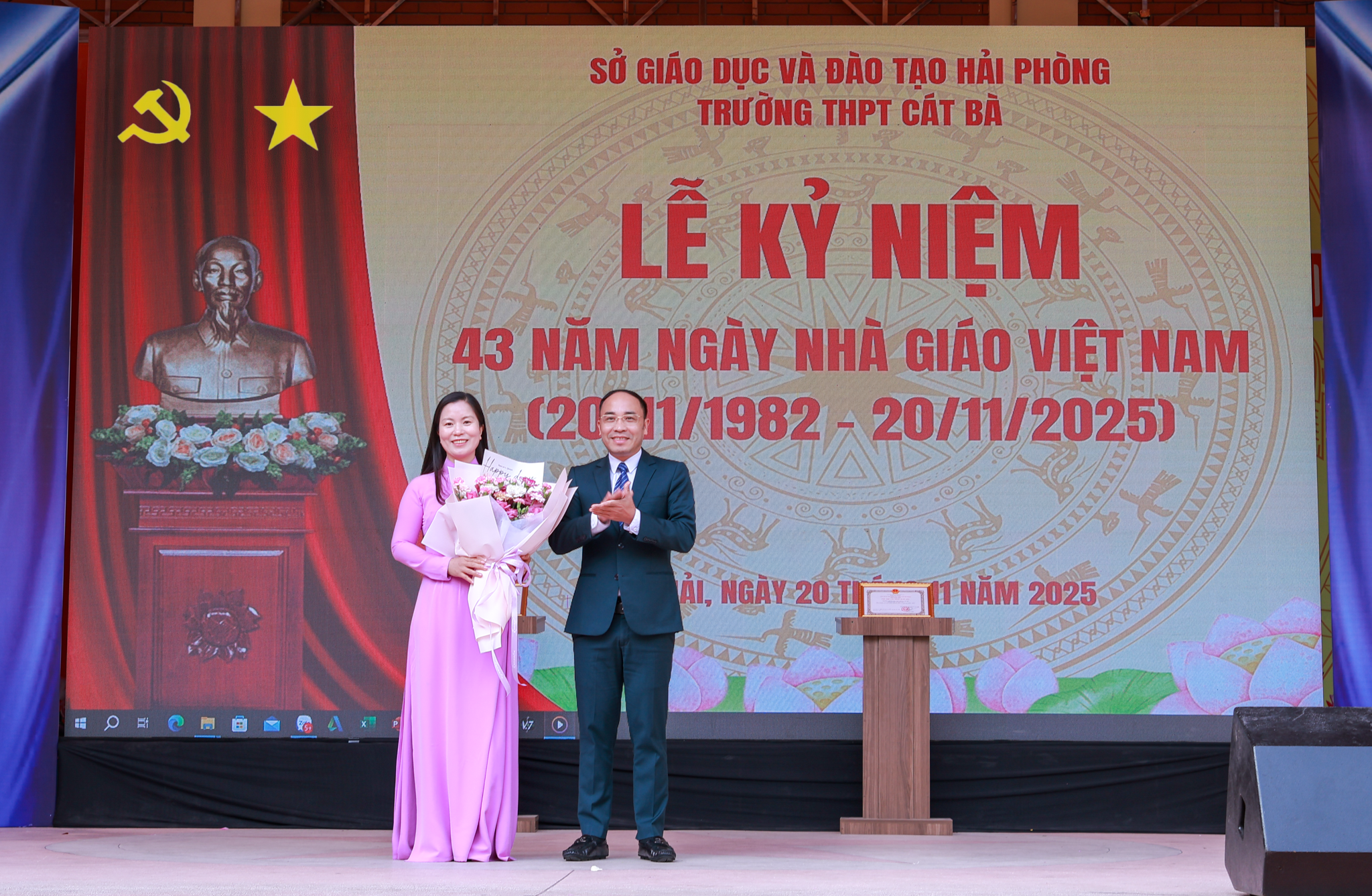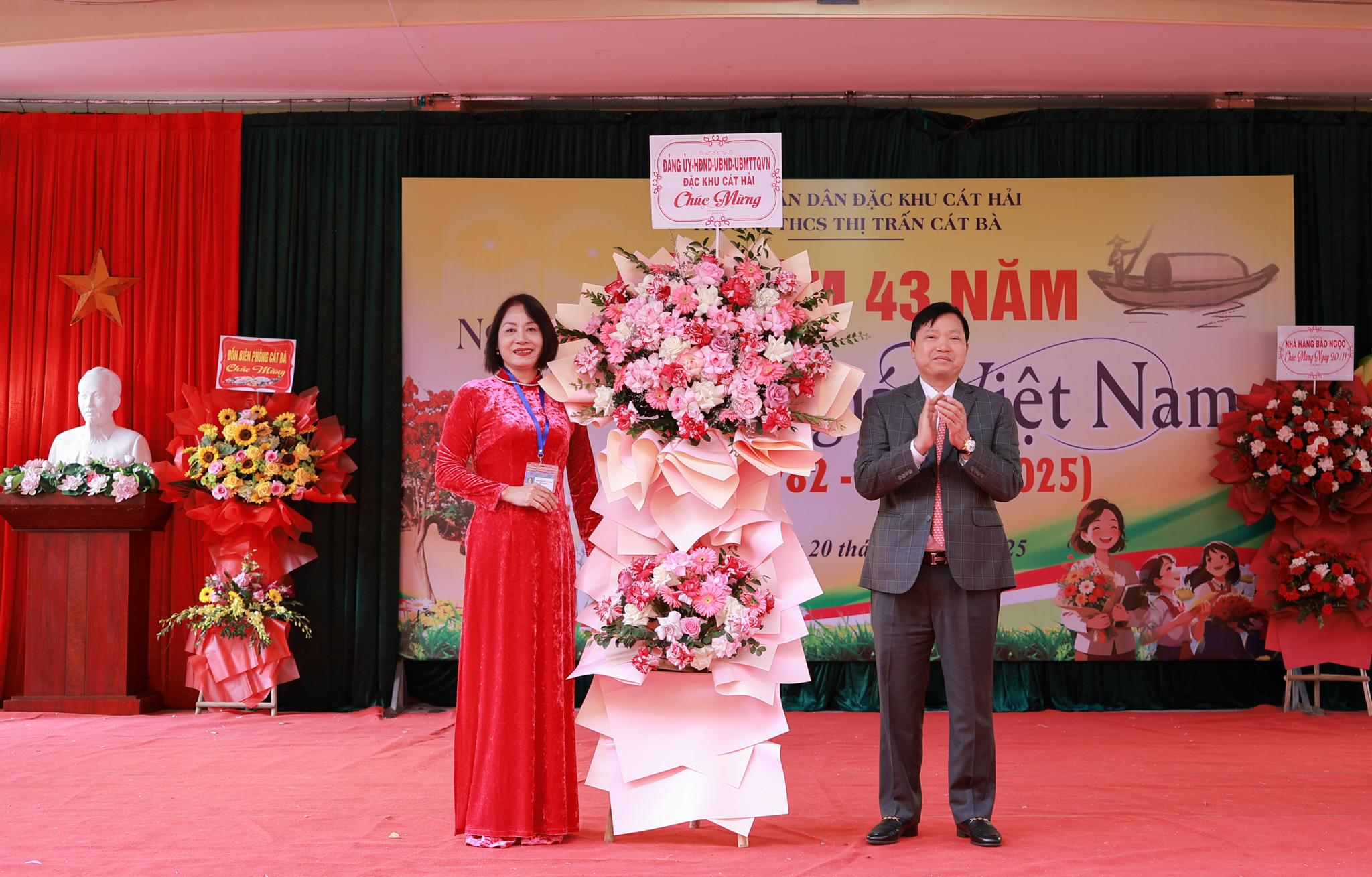 Tiếp đó, tại Trường THPT Cát Bà, đoàn do đồng chí Vũ Thị Mỹ Liên - Ủy viên Ban Thường vụ Đảng uỷ, Chủ tịch Ủy ban MTTQ đặc khu - làm trưởng đoàn, cùng đồng chí Vũ Hữu Vững - Phó Chủ tịch UBND đặc khu và đại diện các phòng, ban đã dự lễ kỷ niệm và gửi lời chúc mừng đội ngũ thầy cô giáo. Nhân dịp này, nhà trường đón nhận Bằng khen của UBND thành phố Hải Phòng vì có thành tích xuất sắc trong năm học 2024 – 2025 và danh hiệu Tập thể Lao động xuất sắc do Chủ tịch UBND thành phố trao tặng. Buổi lễ diễn ra ấm áp với phần tri ân thầy cô qua các thế hệ, văn nghệ chào mừng và lễ tuyên dương giáo viên, học sinh tiêu biểu.
