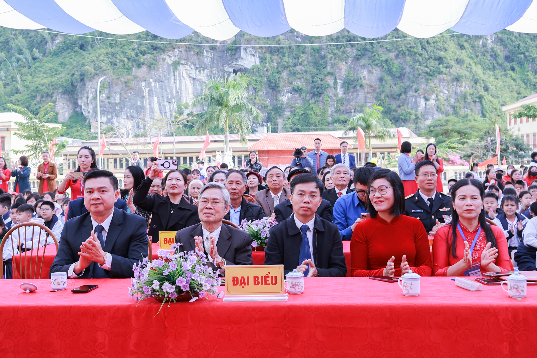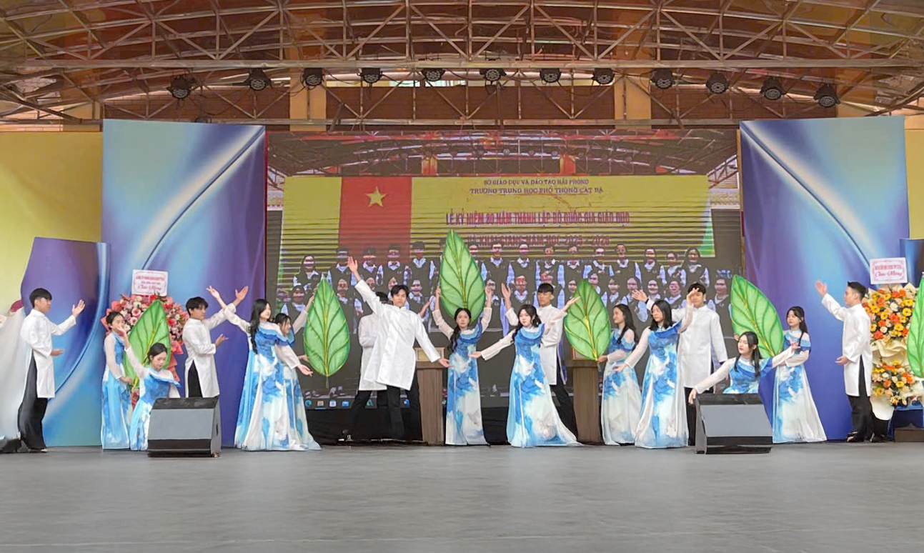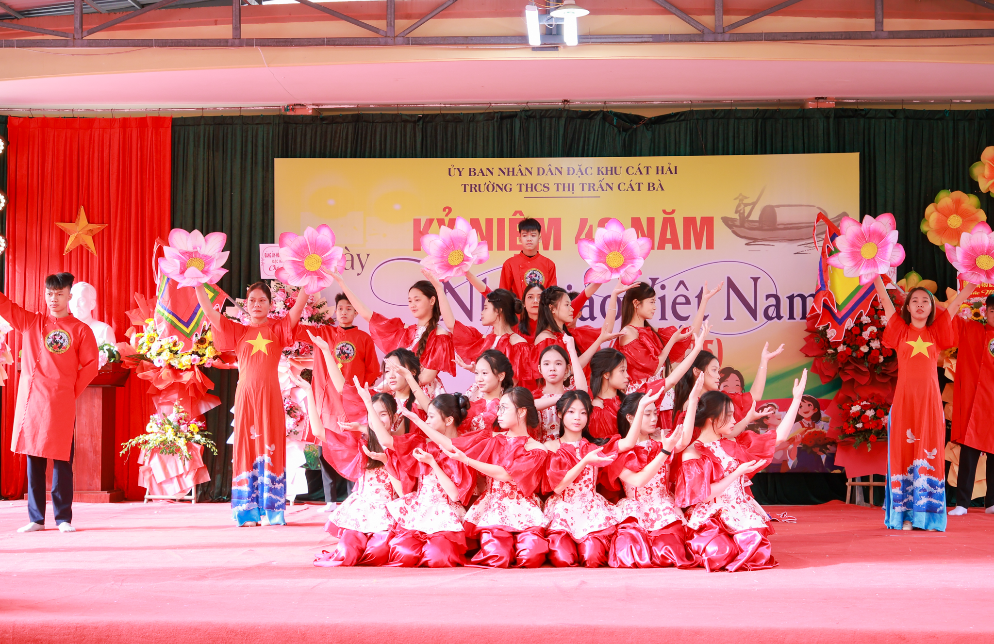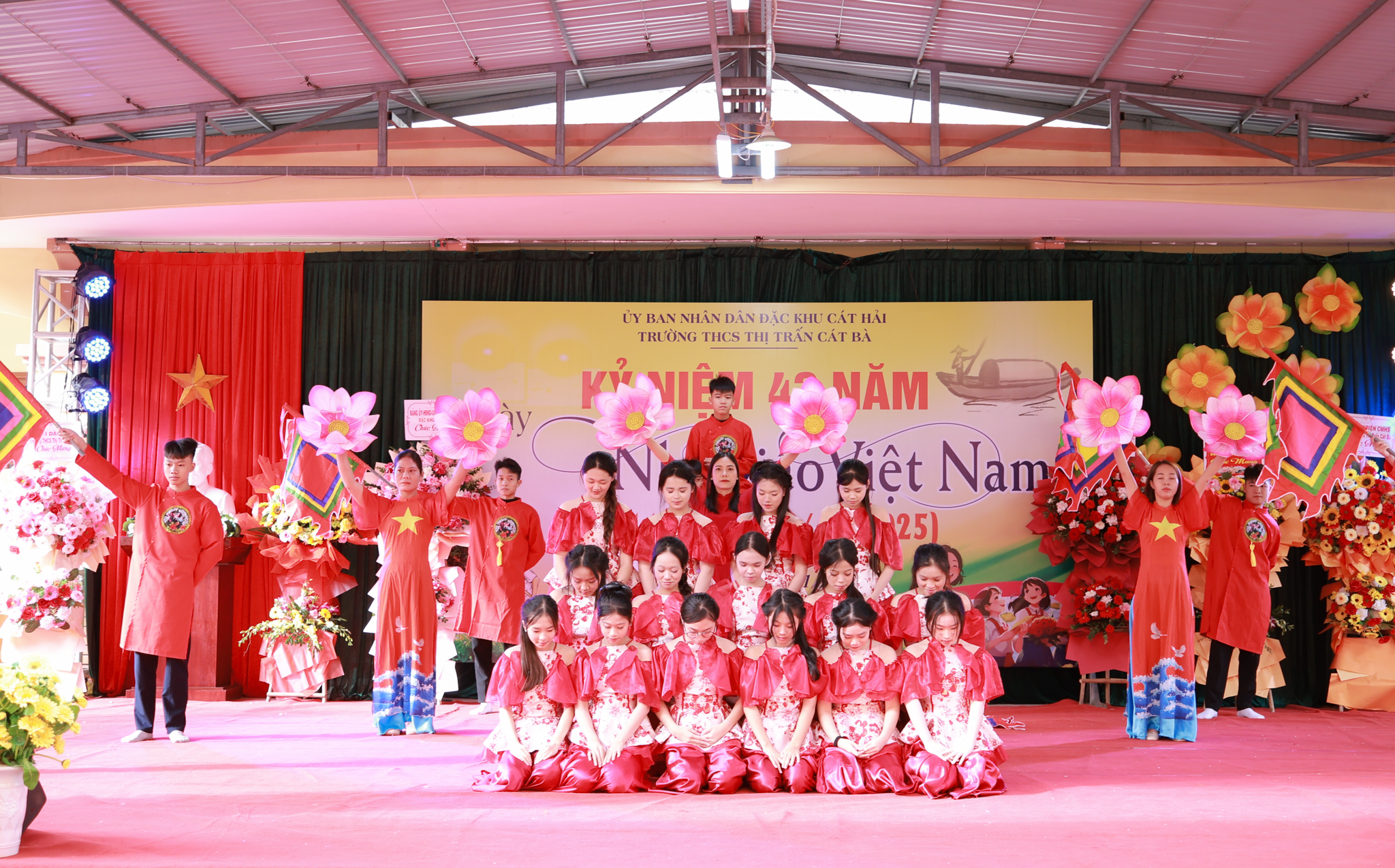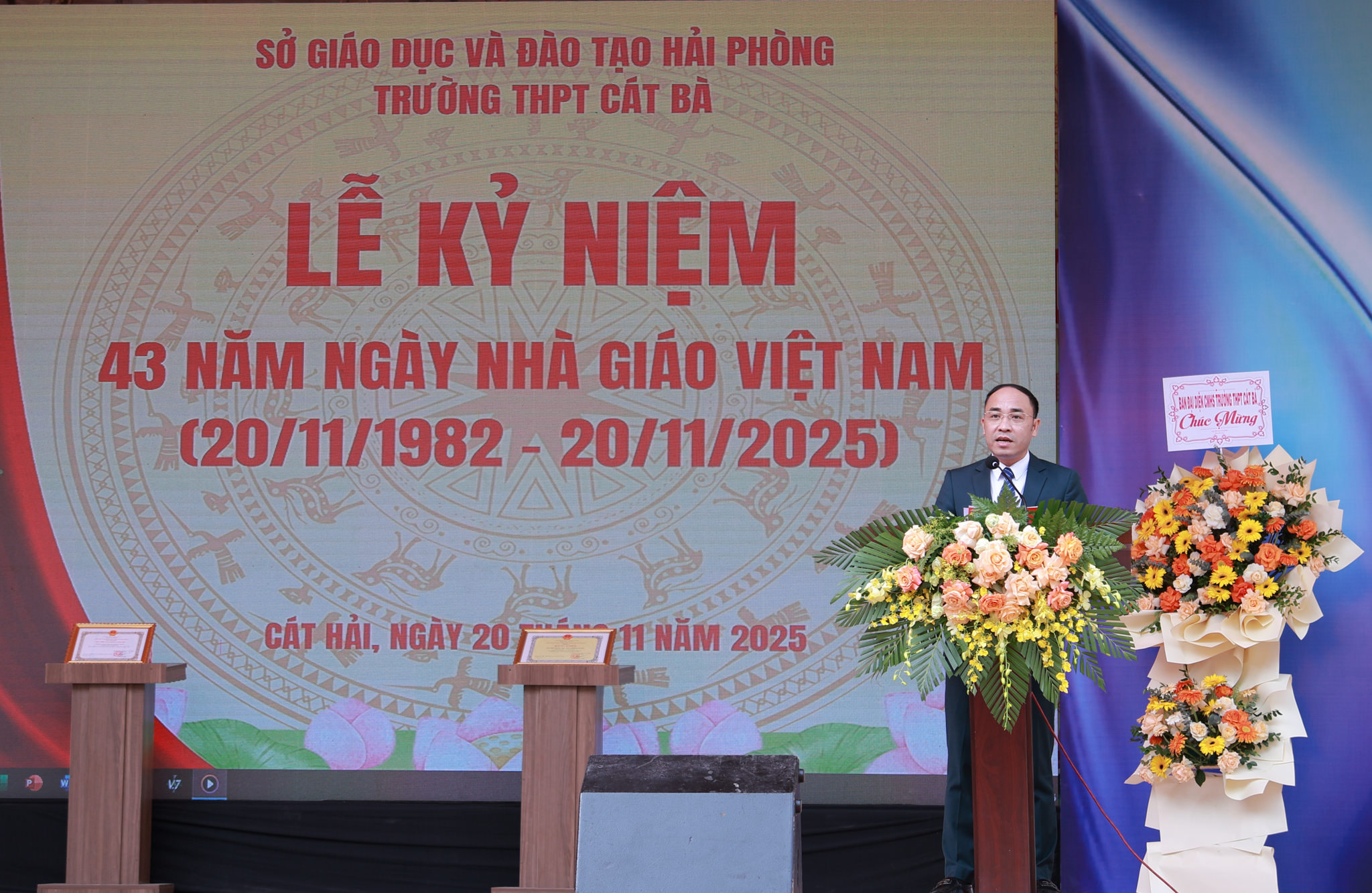 Tiếp đó, tại Trường THPT Cát Bà, đoàn do đồng chí Vũ Thị Mỹ Liên - Ủy viên Ban Thường vụ Đảng uỷ, Chủ tịch Ủy ban MTTQ đặc khu - làm trưởng đoàn, cùng đồng chí Vũ Hữu Vững - Phó Chủ tịch UBND đặc khu và đại diện các phòng, ban đã dự lễ kỷ niệm và gửi lời chúc mừng đội ngũ thầy cô giáo. Nhân dịp này, nhà trường đón nhận Bằng khen của UBND thành phố Hải Phòng vì có thành tích xuất sắc trong năm học 2024 – 2025 và danh hiệu Tập thể Lao động xuất sắc do Chủ tịch UBND thành phố trao tặng. Buổi lễ diễn ra ấm áp với phần tri ân thầy cô qua các thế hệ, văn nghệ chào mừng và lễ tuyên dương giáo viên, học sinh tiêu biểu.