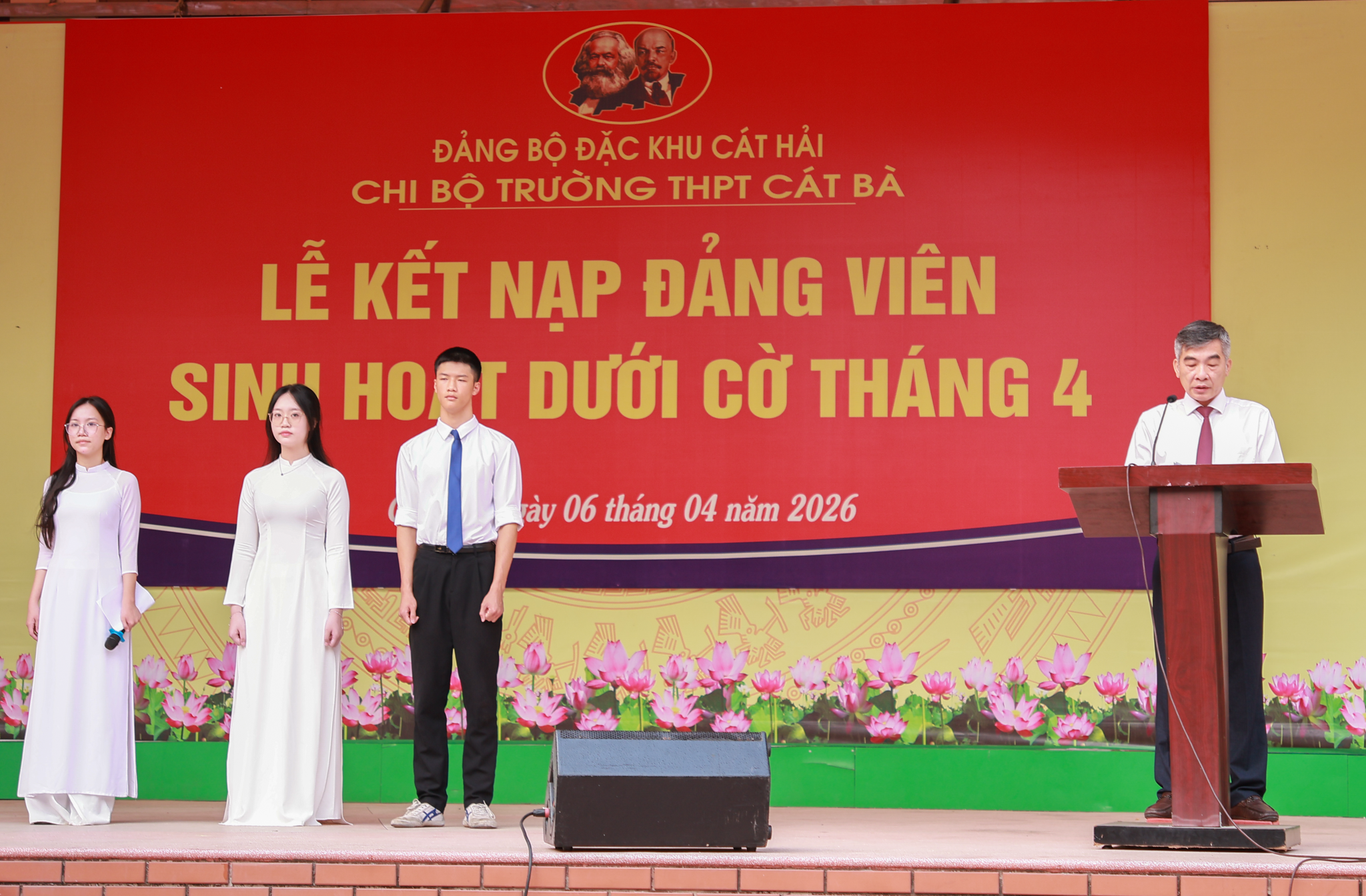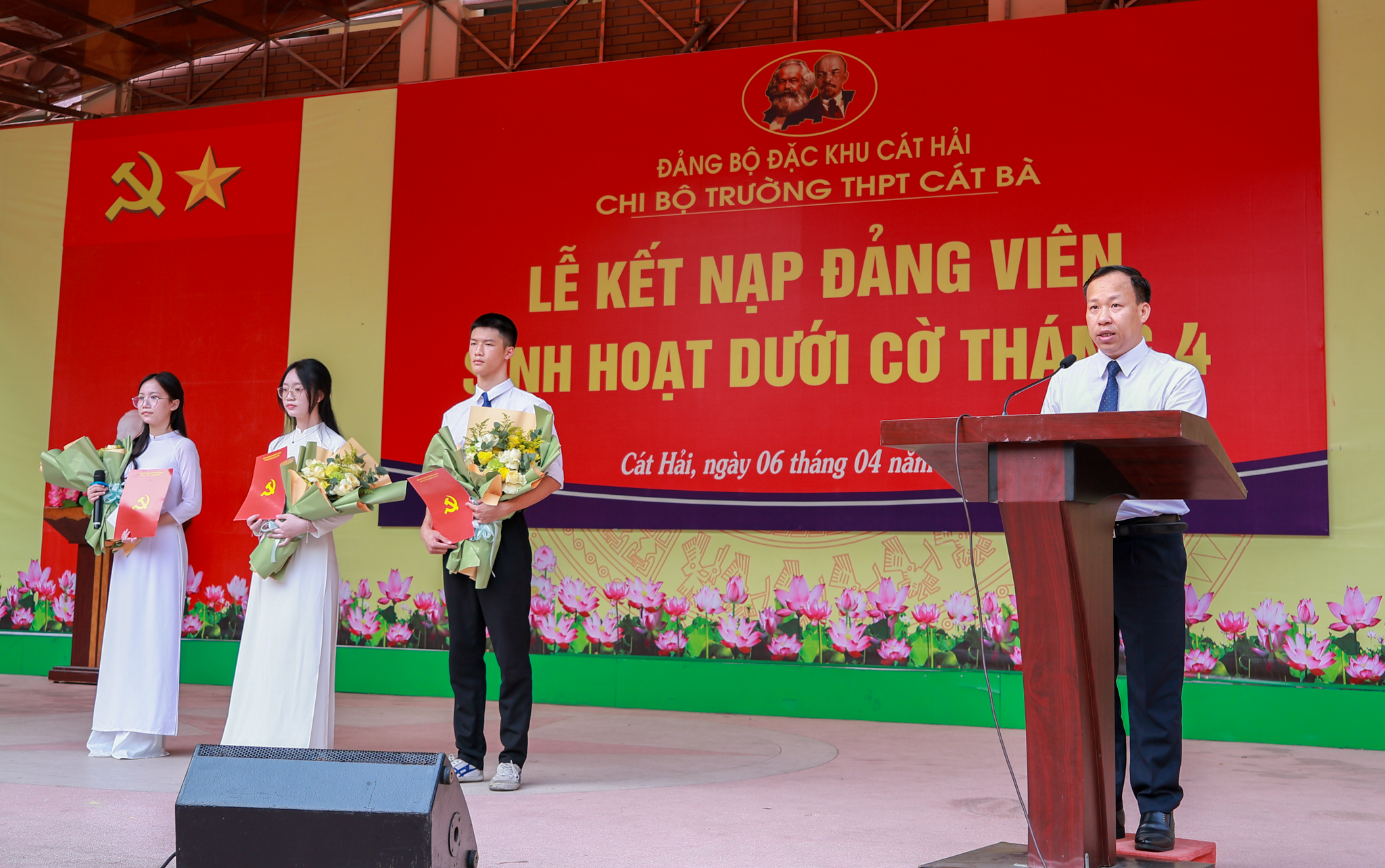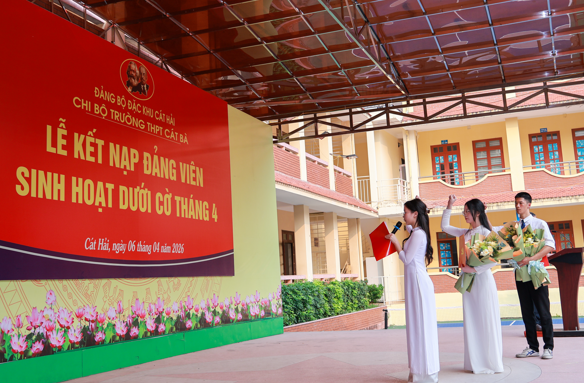 Sáng 6/4/2026, tại Trường THPT Cát Bà (Đặc khu Cát Hải), Chi bộ nhà trường long trọng tổ chức Lễ kết nạp Đảng viên cho các đoàn viên ưu tú là học sinh, đánh dấu bước tiến quan trọng trong công tác tạo nguồn, bồi dưỡng và phát triển đảng viên trẻ ngay từ môi trường giáo dục phổ thông.