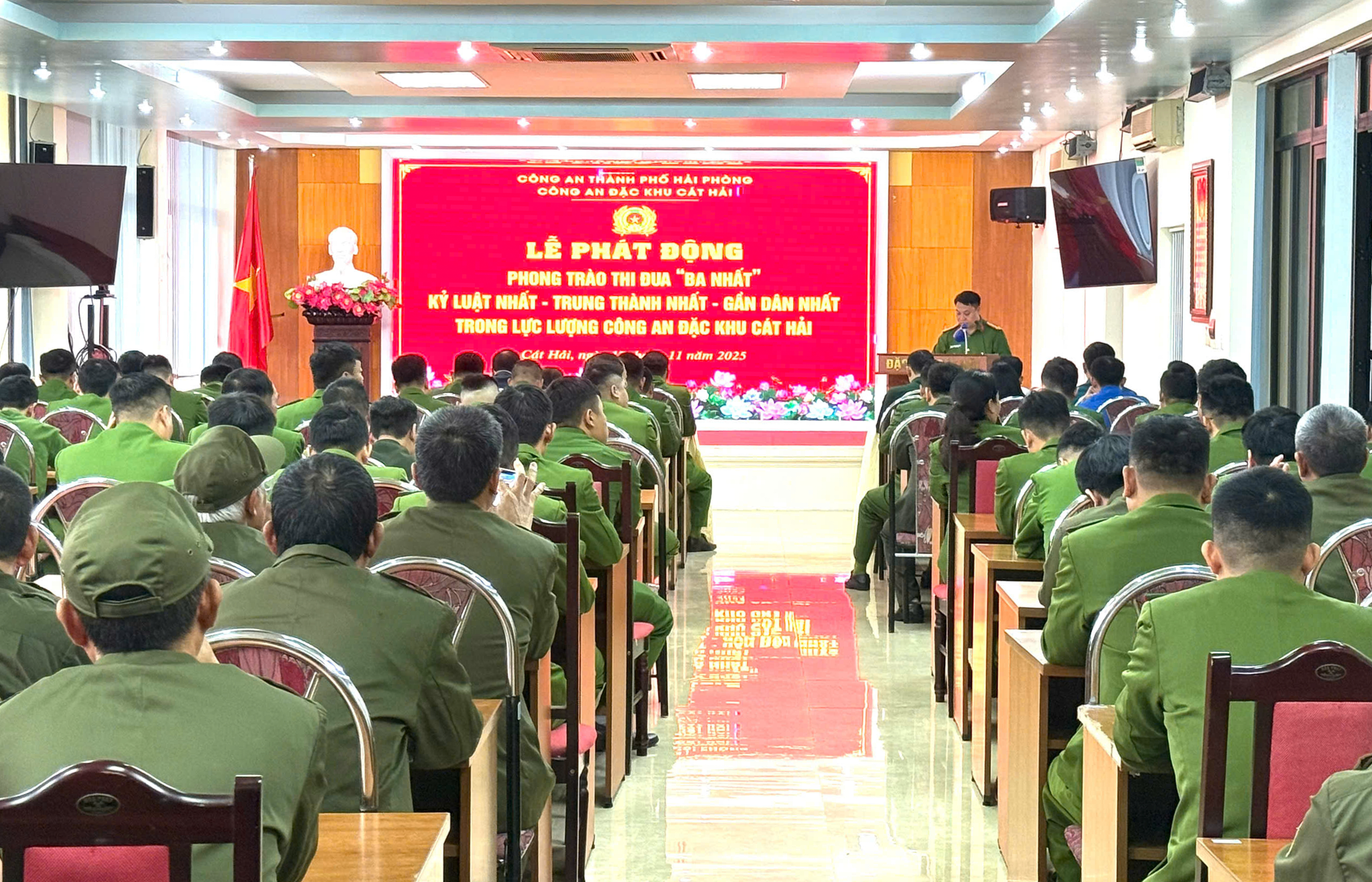 Thực hiện chỉ đạo của Bộ Công an và Giám đốc Công an thành phố Hải Phòng, sáng 17/11/2025, tại hội trường trụ sở HĐND và UBND đặc khu Cát Hải, Công an đặc khu tổ chức Lễ phát động phong trào thi đua “Ba nhất”: Kỷ luật nhất – Trung thành nhất – Gần dân nhất. Phong trào được triển khai nhằm tạo chuyển biến rõ nét trong xây dựng lực lượng, siết chặt kỷ luật, nâng cao hiệu quả công tác và chất lượng phục vụ nhân dân.