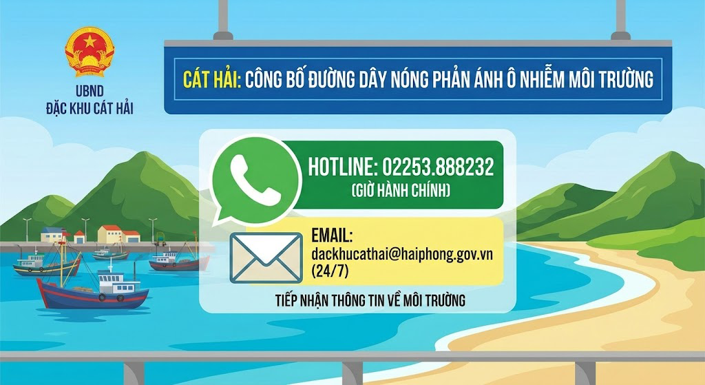 Đặc khu công khai số điện thoại đường dây nóng 02253.888232 (tiếp nhận trong giờ hành chính) và địa chỉ thư điện tử dackhucathai@haiphong.gov.vn (tiếp nhận 24/7). Đây là hai kênh thông tin chính thức phục vụ việc tiếp nhận, tổng hợp và xử lý các phản ánh liên quan đến môi trường.